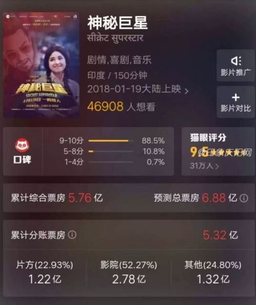 近期,阿米爾·汗投資并參演的《神秘巨星》在中國上映,截至目前,貓眼專業(yè)版數(shù)據(jù)顯示,該影片上映18天已經(jīng)拿到了5.76億元票房,雖然遠比不上《摔跤吧!爸爸》過十億元的爆款級別,但相較于賀歲檔同期上映的《妖鈴鈴》(3.63億元票房)、成龍電影《機器之血》(3.05億元票房)、甚至超級IP《星球大戰(zhàn):最后的絕地武士》(2.68億元票房)等,作為不主流的印度電影《神秘巨星》的票房已經(jīng)非常突出。