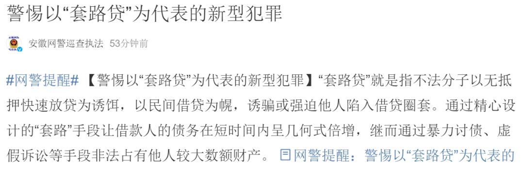據(jù)@安徽網(wǎng)警巡查執(zhí)法 ,“套路貸”就是指不法分子以無抵押快速放貸為誘餌,以民間借貸為幌,誘騙或強迫他人陷入借貸圈套。通過精心設(shè)計的“套路”手段讓借款人的債務(wù)在短時間內(nèi)呈幾何式倍增,繼而通過暴力討債、虛假訴訟等手段非法占有他人較大數(shù)額財產(chǎn)。