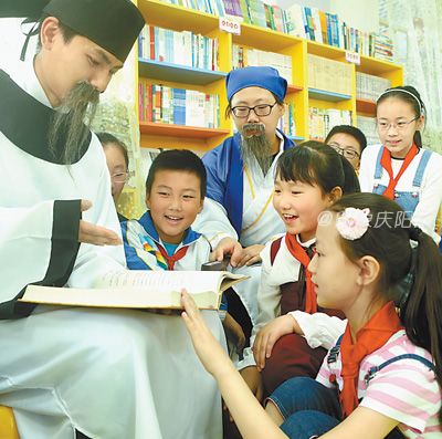 日前,甘肅蘭州市七里河小學(xué)舉辦“賞中華詩詞 做儒雅少年”詩詞大會。圖為該校老師裝扮成李白、杜甫、白居易等古代詩人,與學(xué)生共同參與詩詞大會。(銀 燕 牟 健攝影報道)