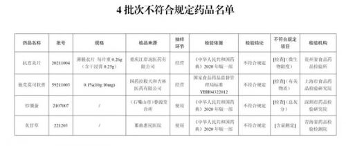 國(guó)家藥監(jiān)局近日發(fā)布通告,經(jīng)貴州省食品藥品檢驗(yàn)所等4家藥品檢驗(yàn)機(jī)構(gòu)檢驗(yàn),發(fā)現(xiàn)4批次藥品不符合規(guī)定。對(duì)檢驗(yàn)出的不符合規(guī)定藥品,藥品監(jiān)督管理部門(mén)已要求相關(guān)企業(yè)和單位采取暫停銷(xiāo)售使用、召回等風(fēng)險(xiǎn)控制措施,對(duì)不符合規(guī)定原因開(kāi)展調(diào)查并切實(shí)進(jìn)行整改。