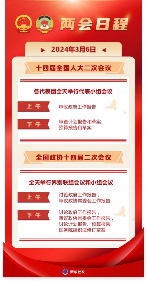 新華社北京3月5日電 十四屆全國人大二次會議各代表團(tuán)6日全天舉行代表小組會議。上午審議政府工作報告,下午審查計(jì)劃報告和草案、預(yù)算報告和草案。