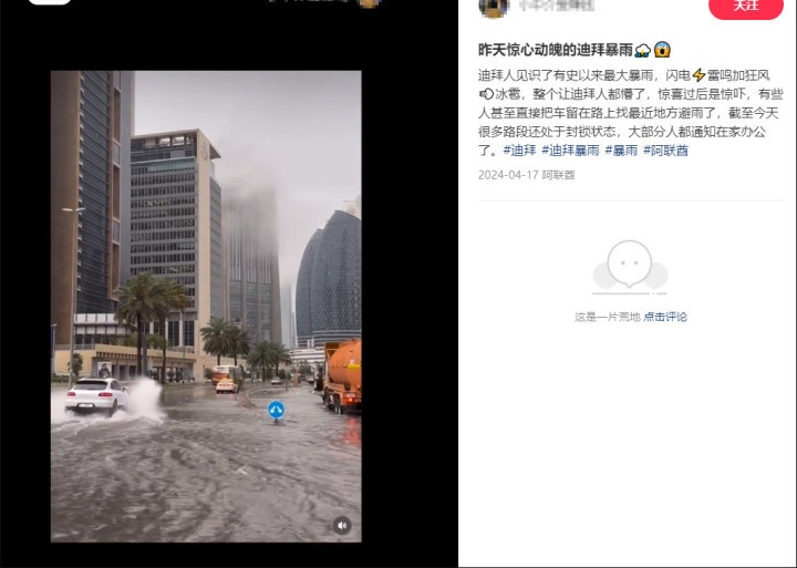“昨天驚心動(dòng)魄的迪拜暴雨,截至今天很多路段還處于封鎖狀態(tài),大部分人都通知在家辦公了。”