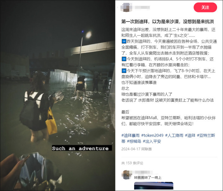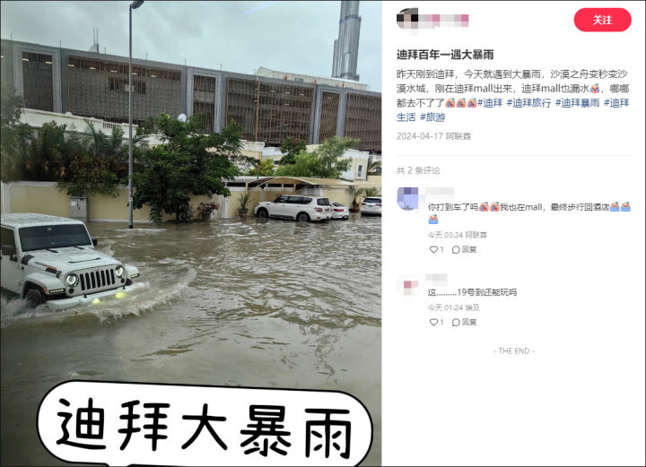 “昨天剛到迪拜,今天就遇到大暴雨,沙漠之舟變秒變沙漠水城。”